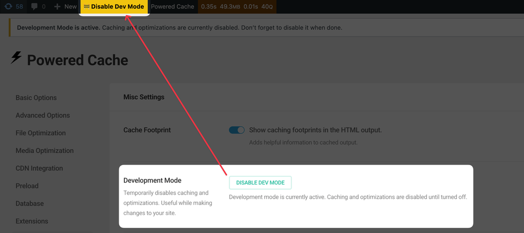 The new Dev Mode is a developer’s best friend. With a single switch, you can disable all caching and optimization features across the site.